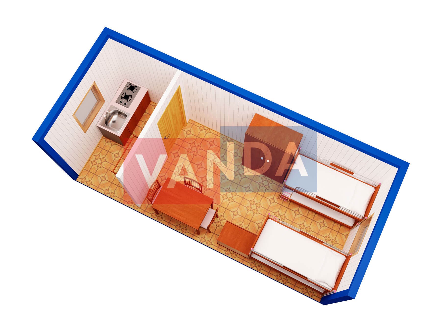 Блок контейнер металлический с кухней в тамбуре 5,85х2,4 изготавливается из несущего каркаса (верхняя и нижняя обвязка): швеллер 100х50х3 мм., угловые стойки: сложно - гнутый угол 90х90х3 мм., крыша блок-контейнера: металл сварной 0,9-1 мм., качественная наружная отделка: оцинкованный профлист, внутренняя отделка стен: Вагонка ПВХ, внутренняя отделка потолка: Вагонка ПВХ, вспомогательный деревянный каркас (стены): брусок 40х75 мм., лаги пола: обрезная доска 40х100 мм., лаги потолка: обрезная доска 40х100 мм., выполнено утепление: Минеральная вата «ISOVER» – 50 мм. и пароизоляция: плёнка техническая, черновой пол состоит из: обрезная доска 20 мм. (2 сорт), чистовой пол покрыт: ДСП строительное 16 мм., отделка пола выполнена из качественных материалов. Контейнер комплектуется окнами: деревянное, двойное остекление 800х1000, входной дверью: ДГ 21-8 обшита снаружи оцинкованным листом, врезной замок и внутренними дверями: ДГ 21-8 (при наличии перегородки). Если в БК присутствуют перегородки, то для них используется: брусок 40х50 мм.