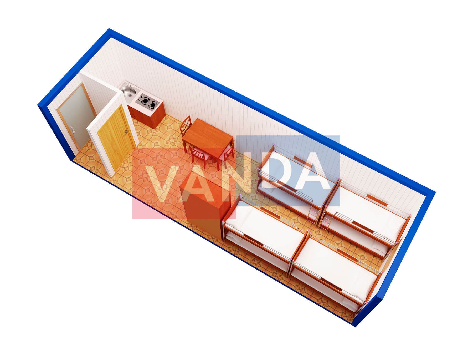 Блок контейнер металлический с 8 кроватями изготавливается из несущего каркаса (верхняя и нижняя обвязка): швеллер 100х50х3 мм., угловые стойки: сложно - гнутый угол 90х90х3 мм., крыша блок-контейнера: металл сварной 0,9-1 мм., качественная наружная отделка: оцинкованный профлист, внутренняя отделка стен: Вагонка ПВХ, внутренняя отделка потолка: Вагонка ПВХ, вспомогательный деревянный каркас (стены): брусок 40х75 мм., лаги пола: обрезная доска 40х100 мм., лаги потолка: обрезная доска 40х100 мм., выполнено утепление: Минеральная вата «ISOVER» – 50 мм. и пароизоляция: плёнка техническая, черновой пол состоит из: обрезная доска 20 мм. (2 сорт), чистовой пол покрыт: ДСП строительное 16 мм., отделка пола выполнена из качественных материалов. Контейнер комплектуется окнами: деревянное, двойное остекление 800х1000, входной дверью: ДГ 21-8 обшита снаружи оцинкованным листом, врезной замок и внутренними дверями: ДГ 21-8 (при наличии перегородки). Если в БК присутствуют перегородки, то для них используется: брусок 40х50 мм.