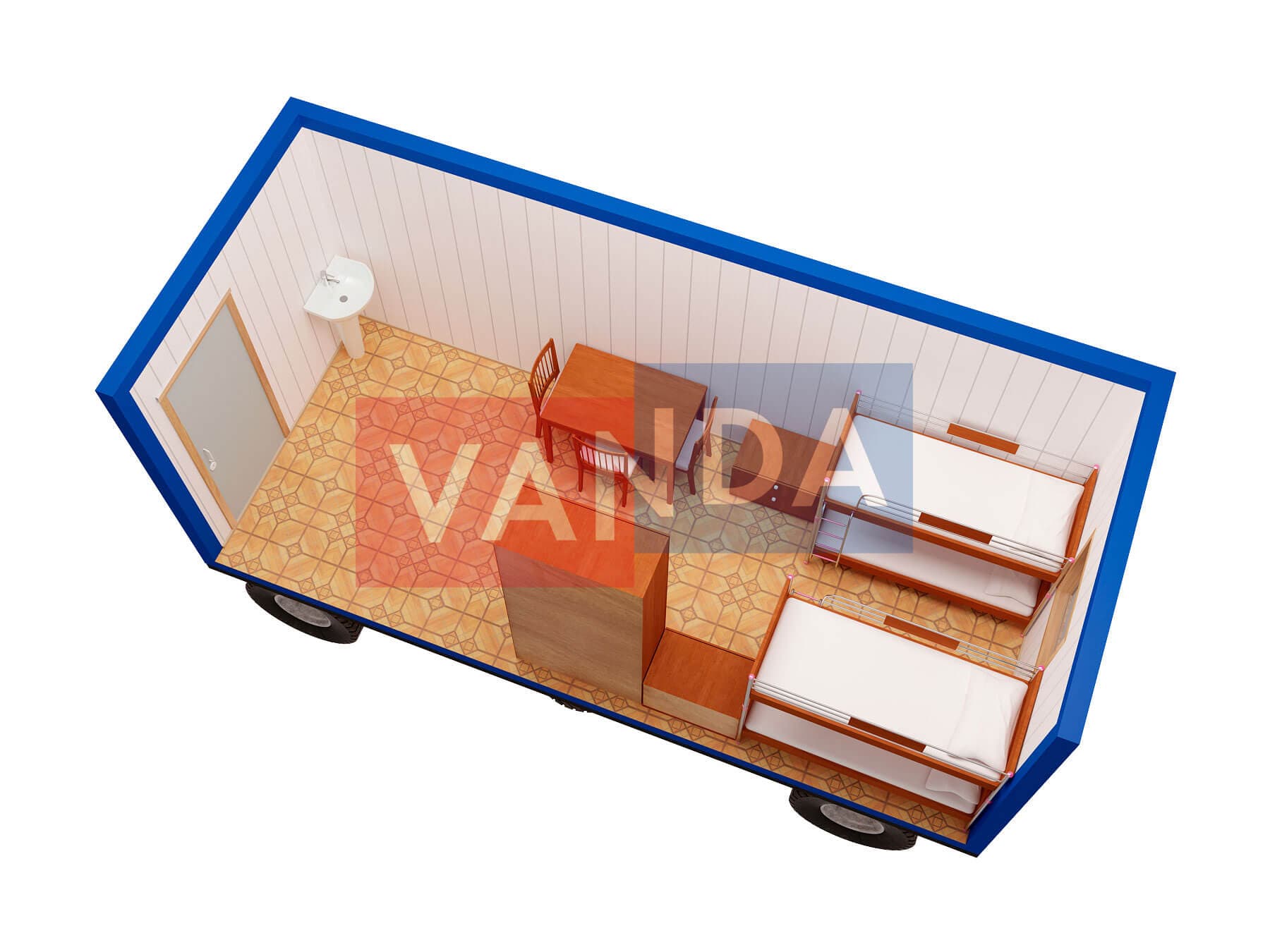 Блок-контейнер на шасси 5,85х2,4 изготавливается из несущего каркаса (верхняя и нижняя обвязка): швеллер 100х50х3 мм., угловые стойки: сложно - гнутый угол 90х90х3 мм., крыша блок-контейнера: металл сварной 0,9-1 мм., качественная наружная отделка: оцинкованный профлист, внутренняя отделка стен: Панели ПВХ, внутренняя отделка потолка: Панели ПВХ, вспомогательный деревянный каркас (стены): брусок 40х75 мм., лаги пола: обрезная доска 40х100 мм., лаги потолка: обрезная доска 40х100 мм., выполнено утепление: Минеральная вата «ISOVER» – 50 мм. и пароизоляция: плёнка техническая, черновой пол состоит из: обрезная доска 20 мм. (2 сорт), чистовой пол покрыт: ДСП строительное 16 мм., отделка пола выполнена из качественных материалов. Контейнер комплектуется окнами: деревянное, двойное остекление 800х1000, входной дверью: ДГ 21-8 обшита снаружи оцинкованным листом, врезной замок и внутренними дверями: ДГ 21-8 (при наличии перегородки). Если в БК присутствуют перегородки, то для них используется: брусок 40х50 мм.