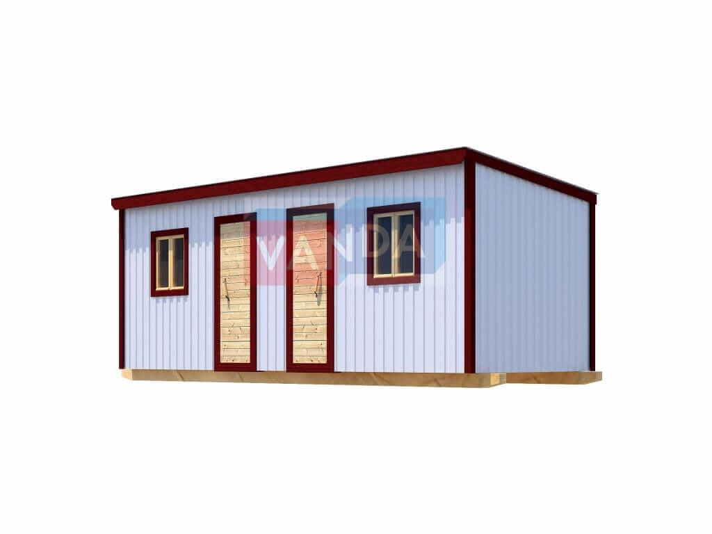 Строительная бытовка без внутренней отделки №6 (вариант 2) изготавливается из качественных материалов: обвязочный венец (сани): брус 100х150 мм., половые лаги: обрезная доска 40х150 мм., через 80 см. (плашмя), черновые полы: обрезная доска 20 мм. (2 сорт), (не сплошной настил, через 10 - 15 см.), чистовой пол покрыт: ДСП строительное 16 мм.. Для изготовления каркаса и перегородок используется: брусок 40х50 мм.. Для стропил используется: обрезная доска 40х150 мм., на кровлю ложится: оцинкованный профлист. Качественная наружная отделка: Профлист. Выполнено утепление полов: Минеральная вата «ISOVER» – 50 мм. и пароизоляция: плёнка техническая. Бытовка комплектуется окнами: деревянное, двустворчатое, одинарное остекление 800х800 мм., входной дверью: деревянная, наборная.