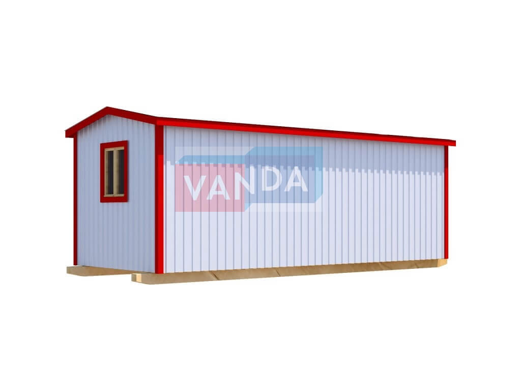 Строительная бытовка со сборкой на месте №5 (вариант 2) изготавливается из качественных материалов: обвязочный венец (сани): брус 100х150 мм., половые лаги: обрезная доска 40х150 мм., через 80 см. (плашмя), черновые полы: обрезная доска 20 мм. (2 сорт), (не сплошной настил, через 10 - 15 см.), чистовой пол покрыт: ДСП строительное 16 мм.. Для изготовления каркаса и перегородок используется: брусок 40х50 мм.. Для стропил используется: обрезная доска 40х150 мм., на кровлю ложится: оцинкованный профлист. Качественная наружная отделка: Профлист, внутренняя отделка стен: Оргалит-ДВП, внутренняя отделка потолка: Оргалит-ДВП. Выполнено утепление: Минеральная вата «ISOVER» – 50 мм. и пароизоляция: плёнка техническая. Бытовка комплектуется окнами: деревянное, двустворчатое, одинарное остекление 800х800 мм., входной дверью: деревянная, наборная и внутренними дверями: деревянная, наборная (при наличии перегородки).