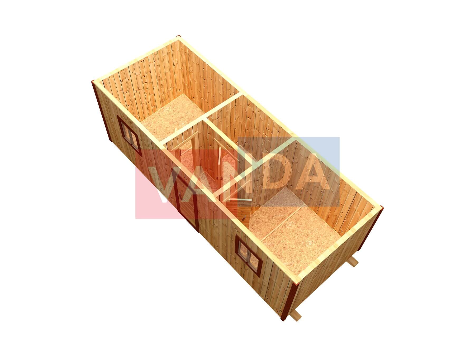 Бытовка строительная утепленная №4 (вариант 3) изготавливается из качественных материалов: обвязочный венец (сани): брус 100х150 мм., половые лаги: обрезная доска 40х150 мм., через 80 см. (плашмя), черновые полы: обрезная доска 20 мм. (2 сорт), (не сплошной настил, через 10 - 15 см.), чистовой пол покрыт: ДСП строительное 16 мм.. Для изготовления каркаса и перегородок используется: брусок 40х50 мм.. Для стропил используется: обрезная доска 40х150 мм., на кровлю ложится: оцинкованный профлист. Качественная наружная отделка: Имитация бруса, внутренняя отделка стен: Вагонка деревянная, внутренняя отделка потолка: Вагонка деревянная. Выполнено утепление: Минеральная вата «ISOVER» – 50 мм. и пароизоляция: плёнка техническая. Бытовка комплектуется окнами: деревянное, двустворчатое, одинарное остекление 800х800 мм., входной дверью: деревянная, наборная и внутренними дверями: деревянная, наборная (при наличии перегородки).