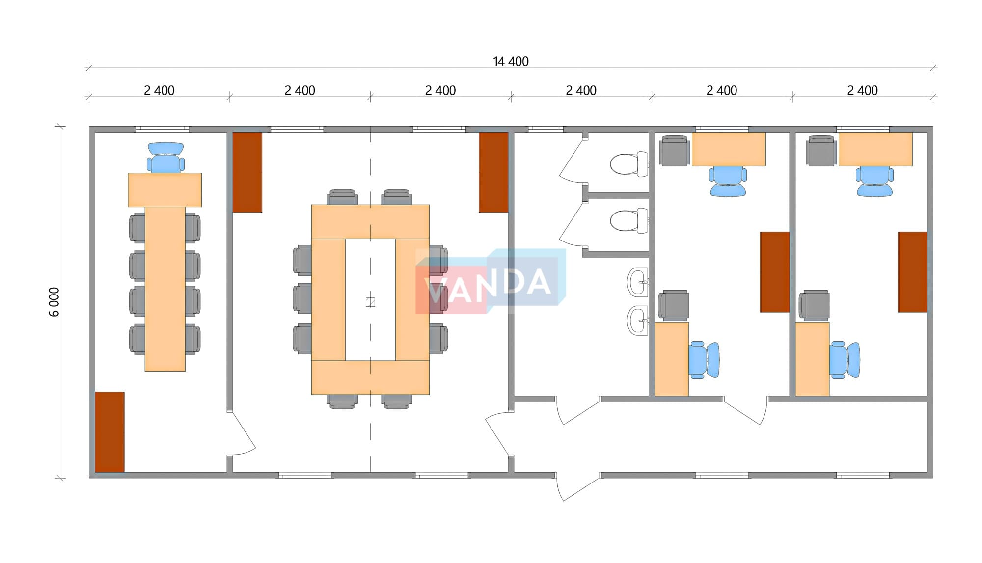 • Габаритные размеры - стандартные размеры одного модульного здания (наружные): Длина: 6 м Ширина: 2,4 м Высота: 2,5 м.